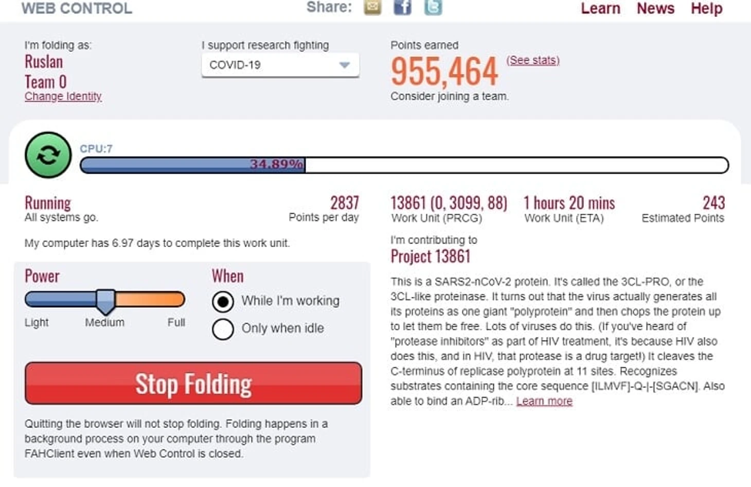 Чтобы помочь проекту, достаточно просто установить клиент с сайта Folding@Home и выбрать проект, на который ваш компьютер будет выделять ресурсы. Конечно, коронавирус – главное направление прямо сейчас, но можно помогать в изучении Альцгеймера, Паркинсона и рака.