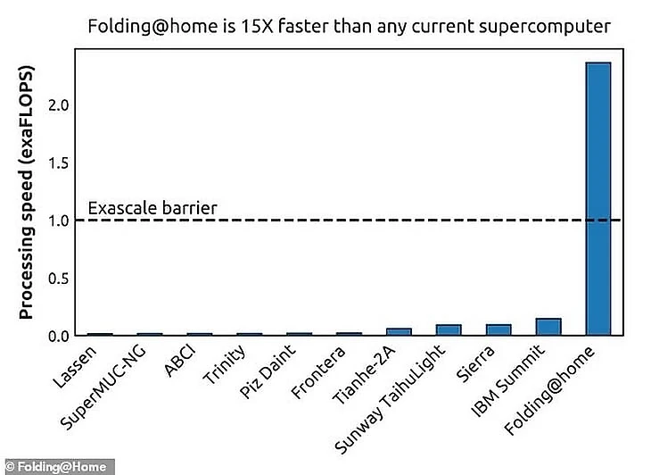 Вычислительная мощность Folding@Home достигает 2,4 эксафлопс – в 15,6 млн раз мощнее, чем топовая модель MacBook Pro. Более того, суммарная мощность 500 лучших суперкомпьютеров в мире не дотягивает до общих ресурсов сети.