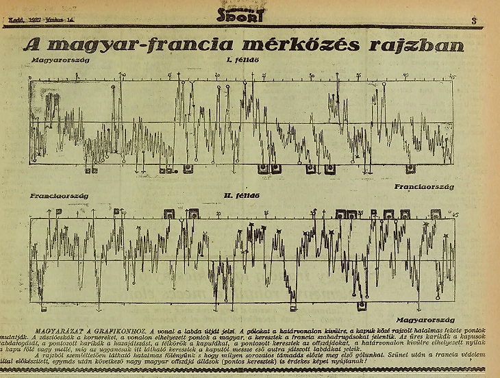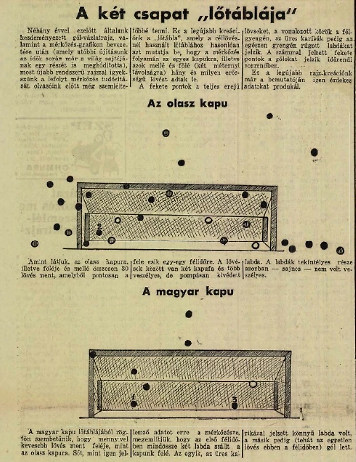 В 1936-м Nemzeti Sport перешла на новый уровень: после игр рисовала раскладку по ударам. Вот такие данные по матчу Италия – Венгрия.