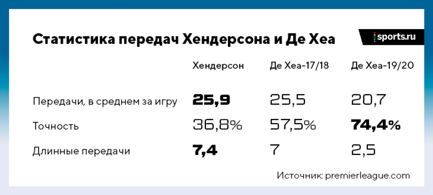 Помимо психологии, Дину придется адаптироваться к важным отличиям в стиле игры. Ниже – сравнение Хендерсона и двух разных Де Хеа: при Моуринью (для чистоты цифр указан последний полный сезон при Жозе) и Сульшере.