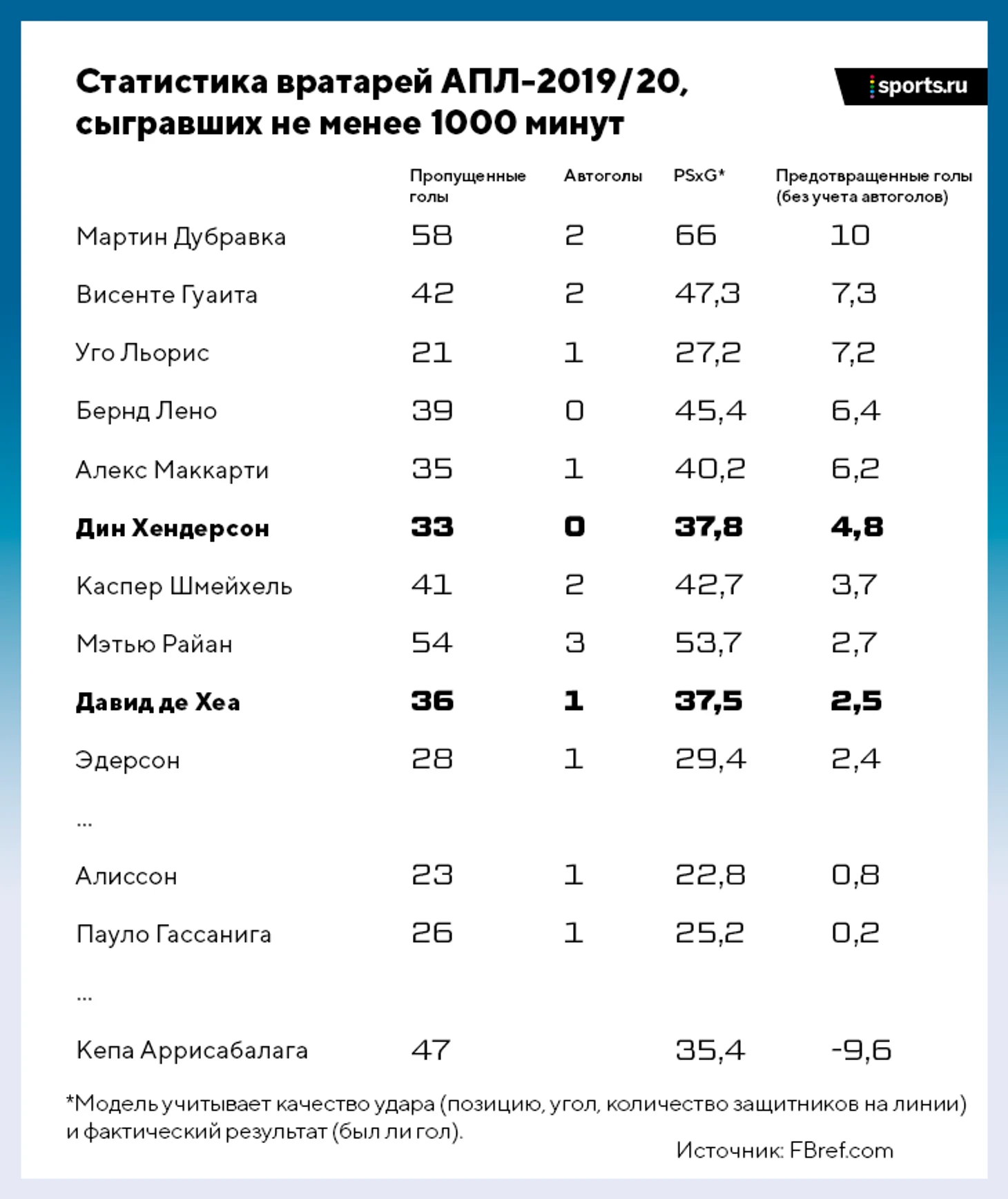 Полную картину дадут только все модели в совокупности (плюс просмотр матчей), но она точно не такая однозначная, как кажется уставшим от Де Хеа людям. Да, он ошибается слишком часто, но на дистанции его шотстоппинг все еще хорош. Не факт, что Хендерсон, оказавшись в его условиях, покажет себя лучше – вероятно, будет меньше ярких ошибок, но это же лишь часть картины.
