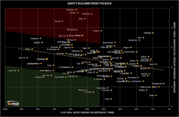 Такая же разница прослеживается и в длине удара от ворот. Де Хеа в среднем выносит мяч на 31,1м – наименьший результат в лиге. Хендерсон в «Шеффилде» – на противоположном конце рейтинга: англичанин пуляет мяч на 69,3м.