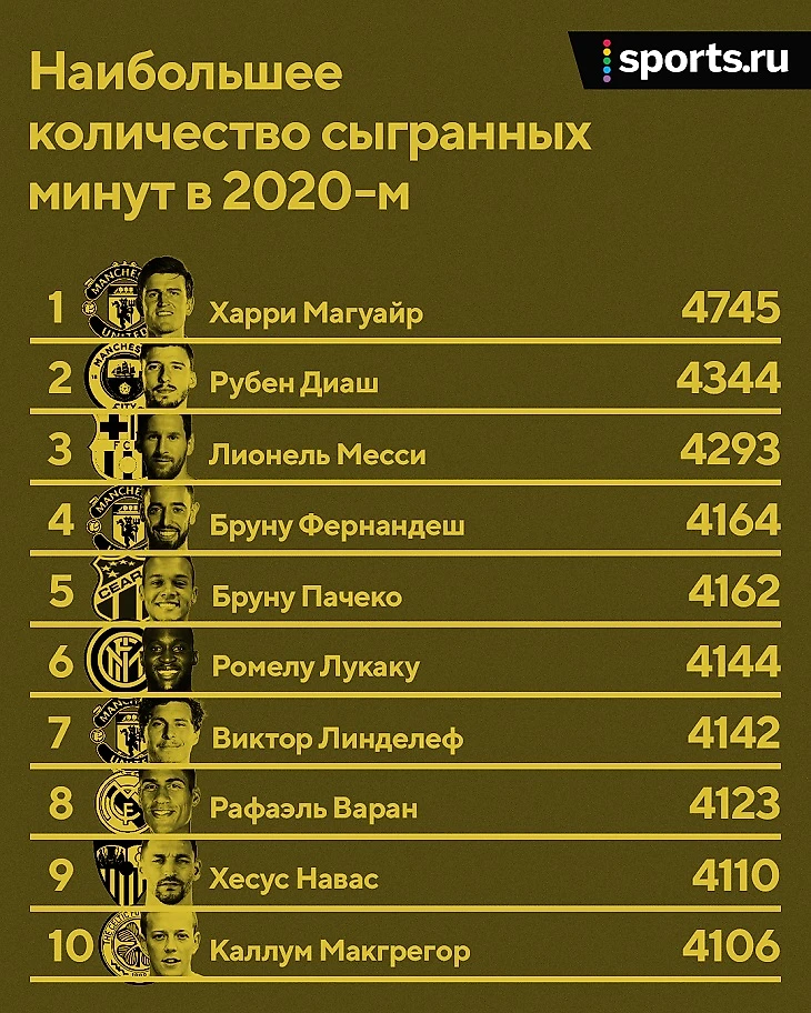 Магуайр сыграл в 2020-м больше всех – даже у вратарей меньше! В топ-3 Диаш и Месси