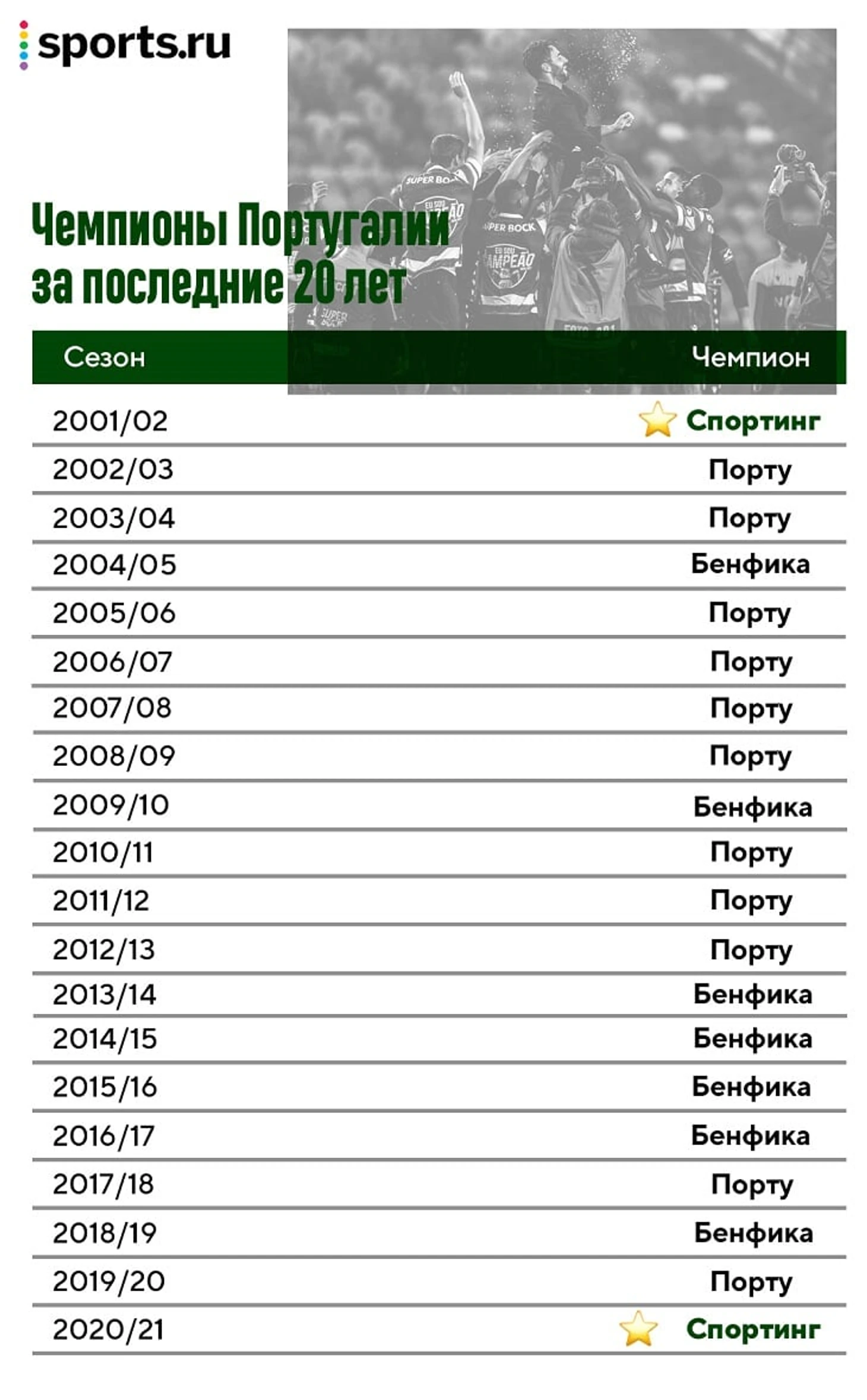 Фаны готовились к очередному провалу, но команда идеально ответила на неудачи: 0 поражений в чемпионате и титул за два тура до конца. Мы привыкли говорить о троевластии в Португалии, но «Спортинг» стал чемпионом впервые за 19 лет.