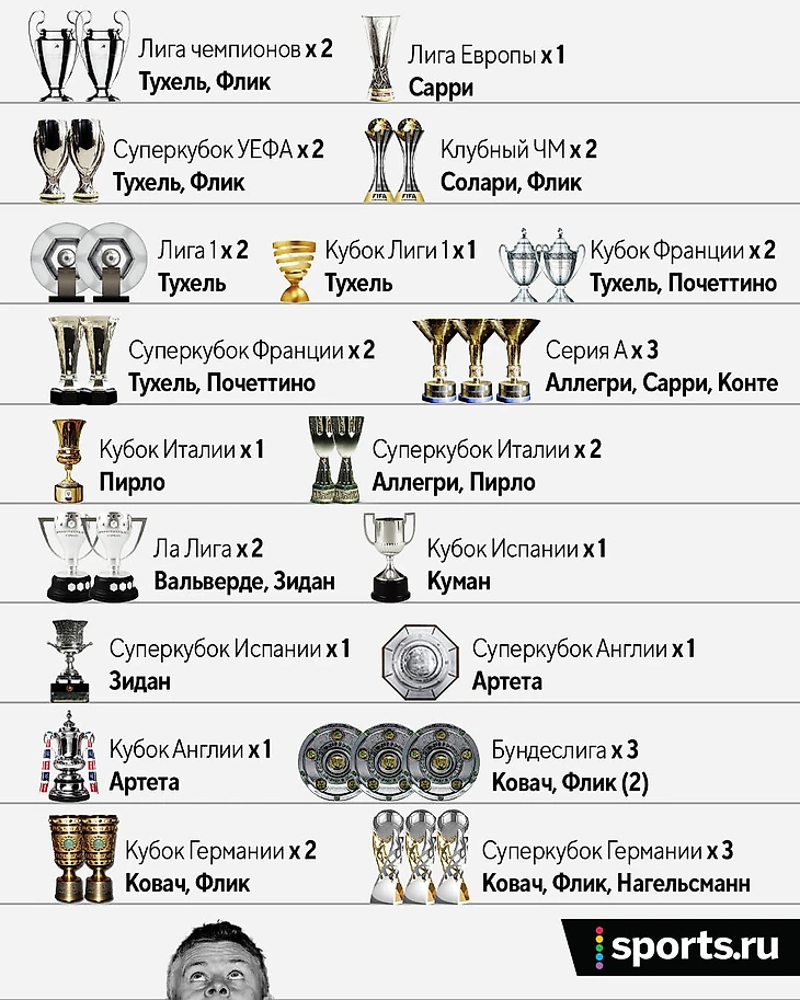 Другие клубы в Европе были менее терпеливы: меняли тренеров, когда что-то шло не так (хотя кто-то уходил сам) – это не обязательно помогало. Мы добавили к «МЮ» еще девять топов, в которых за время работы Оле хоть раз сменился тренер, и посчитали титулы.