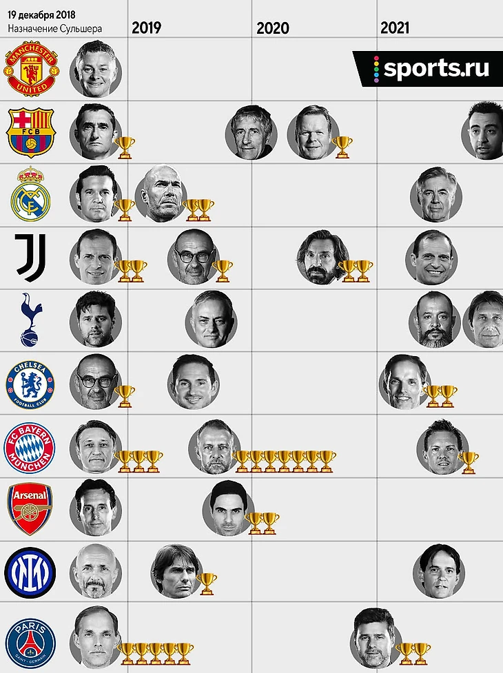 28 разных тренеров и 34 трофея: все это успели топ-клубы, пока «МЮ» руководит Сульшер