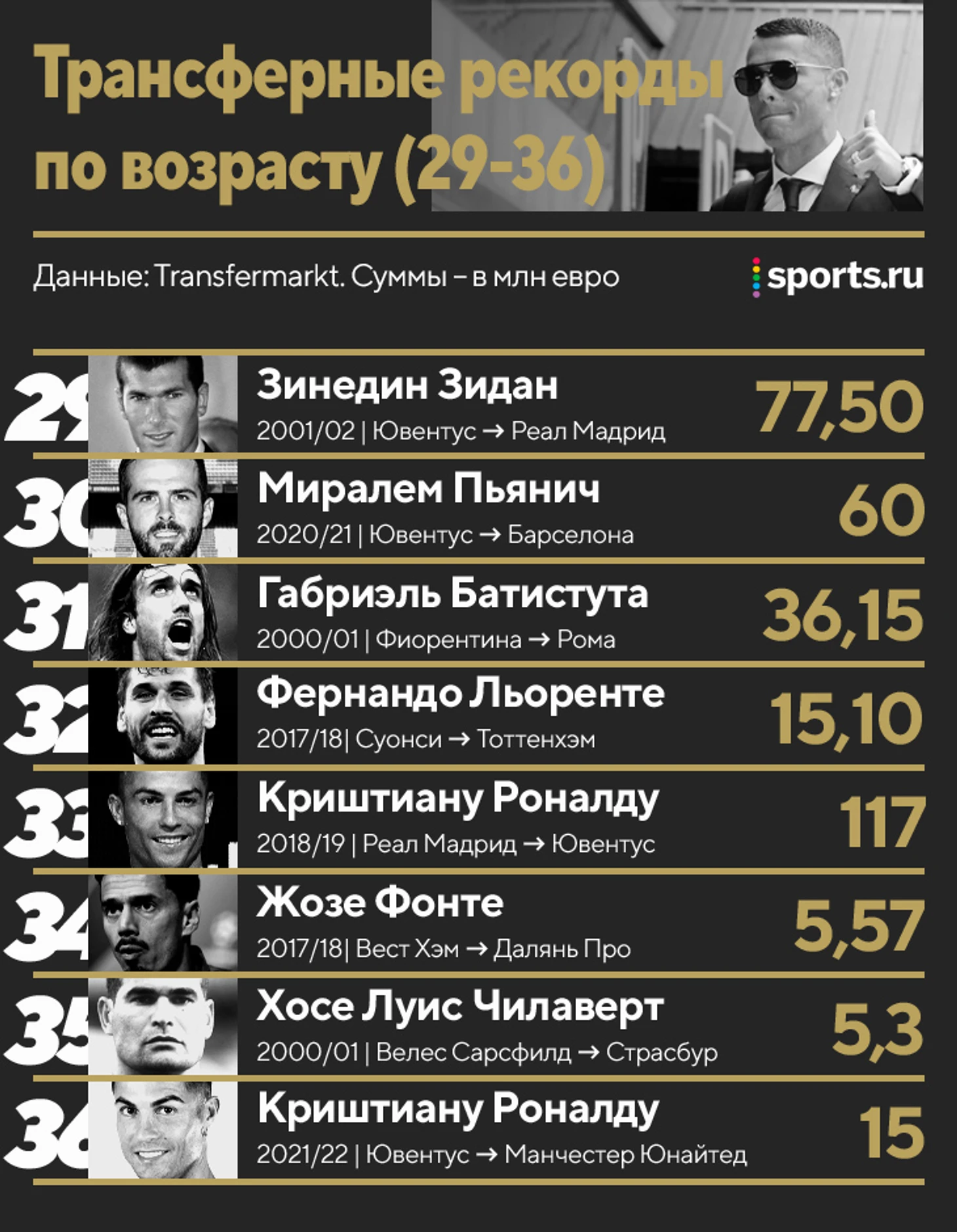 В начале июня мы собрали 79 рекордов Криштиану Роналду – вот вам восьмидесятый факт: переход португальца стал самым дорогим трансфером 36-летнего футболиста. По информации The Athletic, «Манчестер Юнайтед» прошлым летом заплатил 15 миллионов евро, бонусами «Ювентус» может получить еще 8 миллионов.