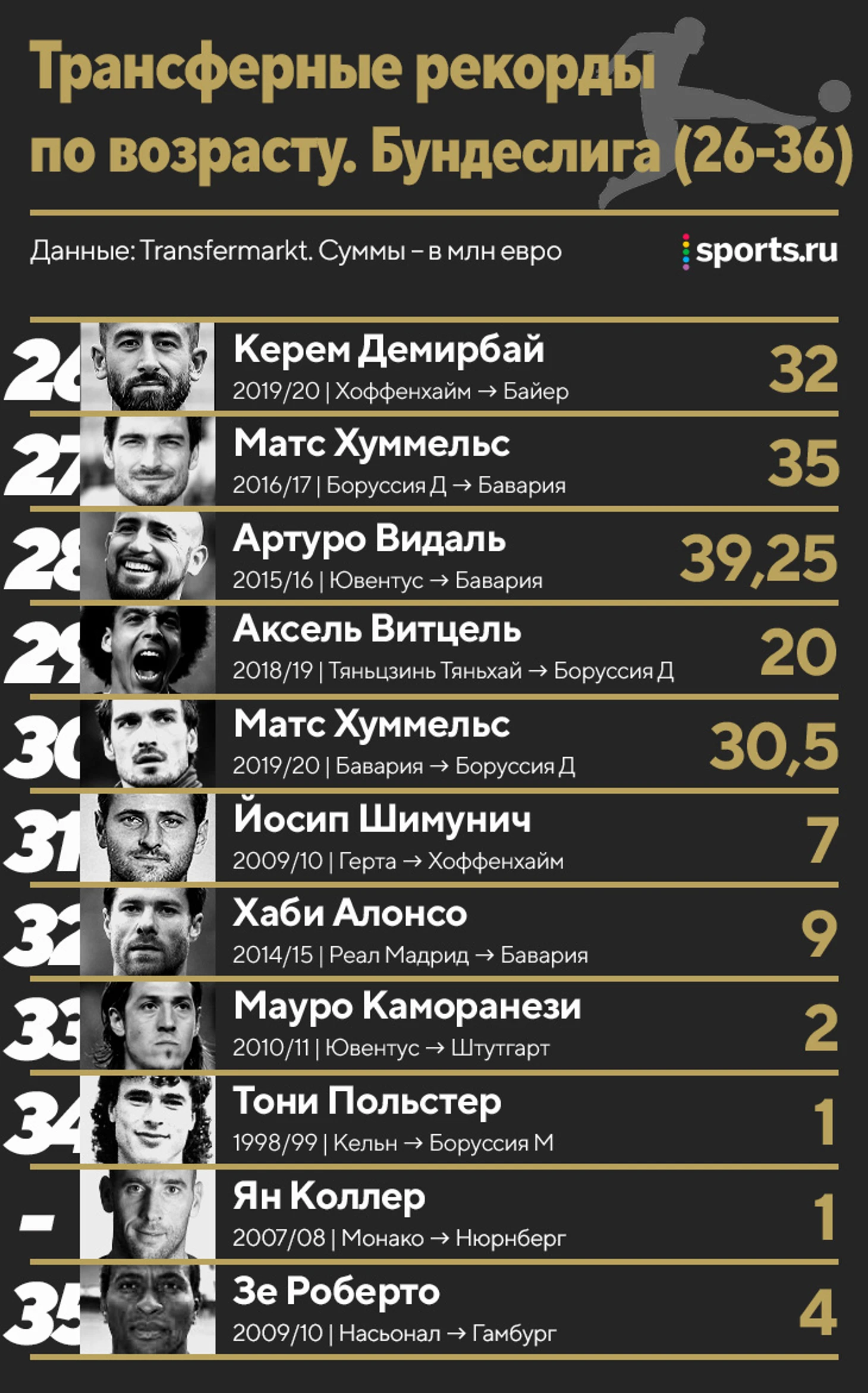 В Бундеслиге не нашлось 36-летних игроков, переходивших за деньги – было несколько переходов свободными агентами, и на этом все. Поэтому без цифры 36 в списке, зато нашлась дополнительная строчка, чтобы уважительно поместить Яна Коллера.