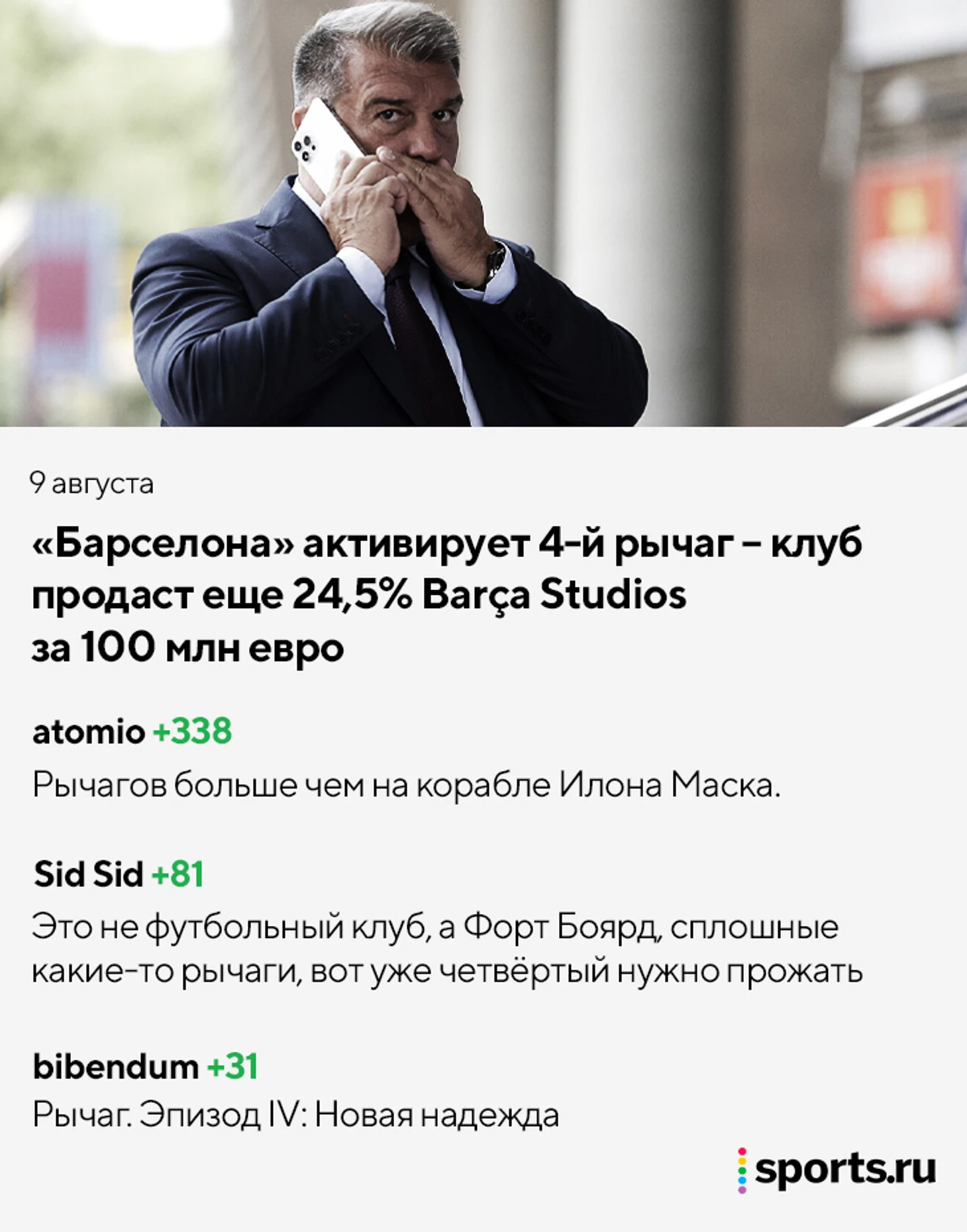• Четвертый рычаг. «Барса» продаст фонду GDA Luma еще 24,5% акций Barça Studios – фирмы, занимающейся созданием творческих продуктов для клуба.