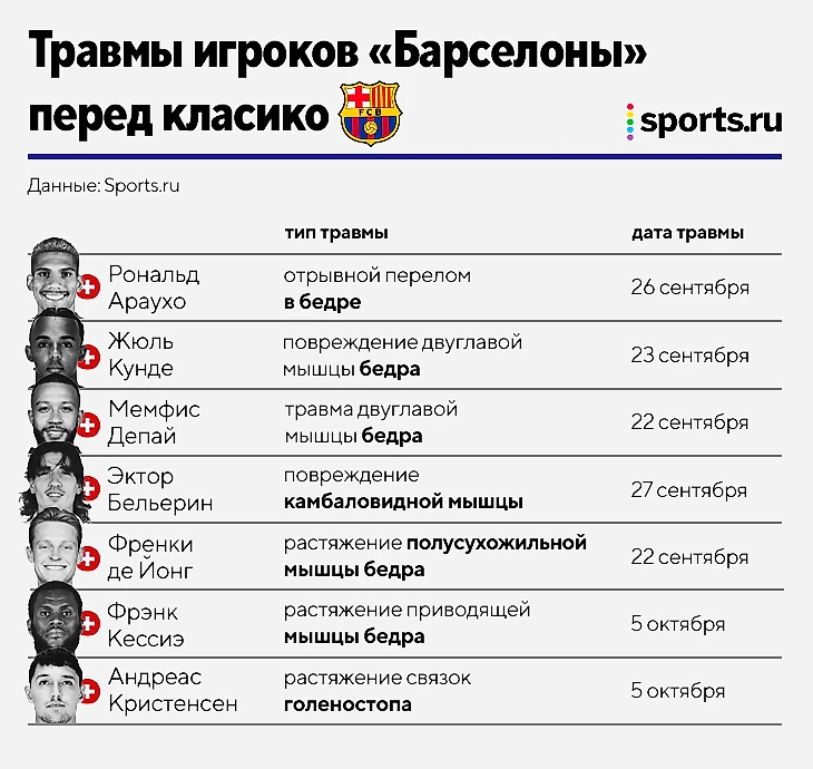 • Сильнее всего по «Барсе» ударили матчи сборных – там травмировались Депай, де Йонг, Кунде и Араухо. Бельерин получил повреждение на тренировке. О травмах Кристенсена и Кессиэ «Барса» объявила после матча с «Интером»;