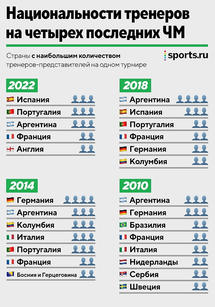 А теперь самое интересное. Тренеров какой национальности больше всего на чемпионате мира в Катаре? А сколько было в прошлые годы?