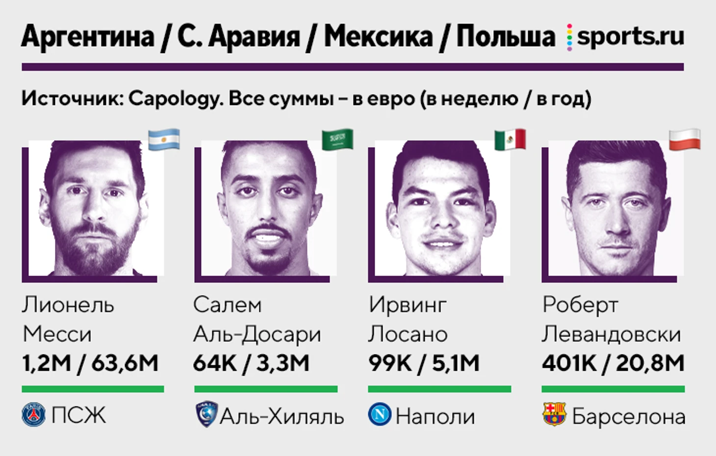 • Ждали что-то про Месси или Левандовского? Зря, ловите факт про Ирвинга Лосано. Перейдя в «Наполи» в 2019-м, мексиканец увеличил зарплату в 6 раз: в ПСВ ему платили всего 16к евро в неделю. • Ладно, держите пункт и про Роберта. Если он отработает контракт с «Барсой» до конца (в конце сезона-2025/26 Леве будет 37), то за четыре года в Испании заработает 83,3 млн евро.
