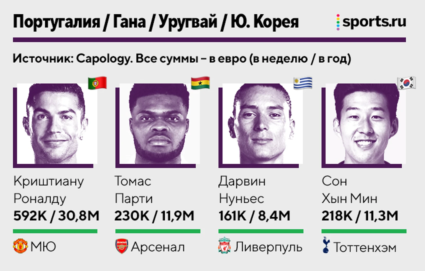 • Только в группе H все самые высокооплачиваемые игроки – из одной лиги. • Фактическая зарплата Роналду на 25% меньше. Такое снижение коснулось нескольких игроков «МЮ», точно известно, что в их числе Криштиану и Давид Де Хеа. Все из-за невыхода «Ман Юнайтед» в Лигу чемпионов.