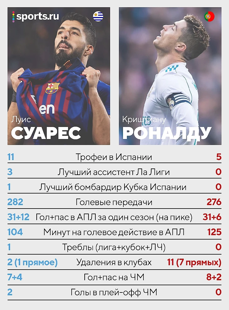 Даже не будем сравнивать награды: тут все очевидно и без табличек. Кажется, что Криштиану лучше во всем, но мы нашли сразу десять пунктов, в которых Суарес превзошел Роналду.