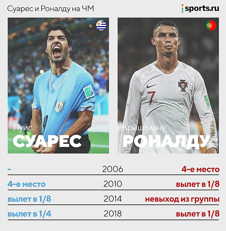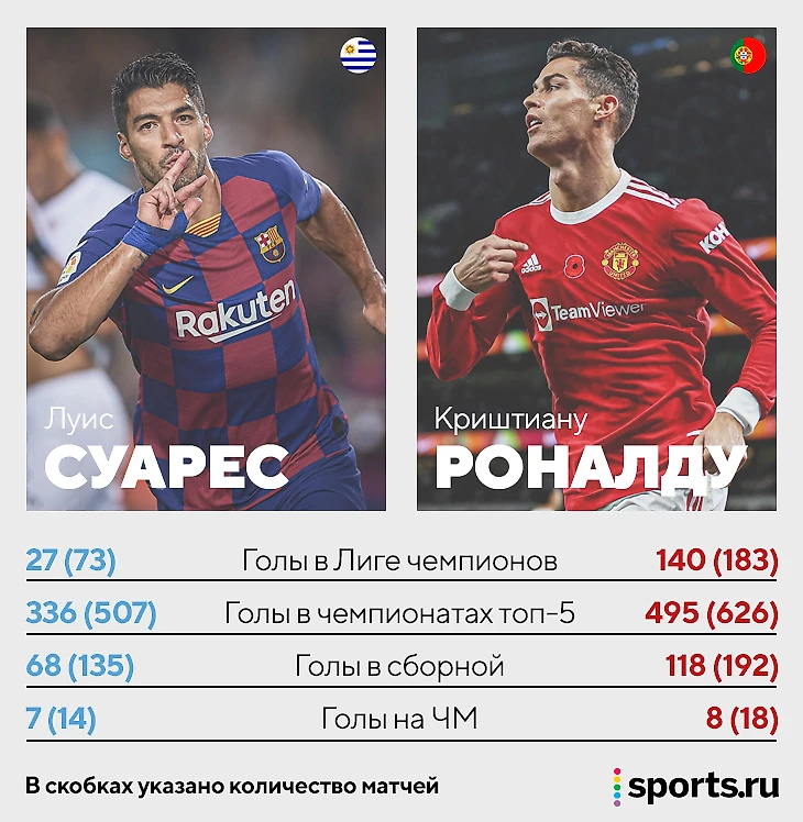В понедельник на ЧМ-2022 играют Португалия и Уругвай. У Луиса Суареса и Криштиану Роналду много точек противопоставления: в Англии играли за «МЮ» и «Ливерпуль» (но не пересекались), в Испании − за «Реал» и «Барсу»; оба главные бомбардиры своих сборных в истории.