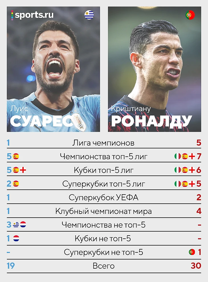 В чем Суарес успешнее Роналду? Есть минимум 10 пунктов