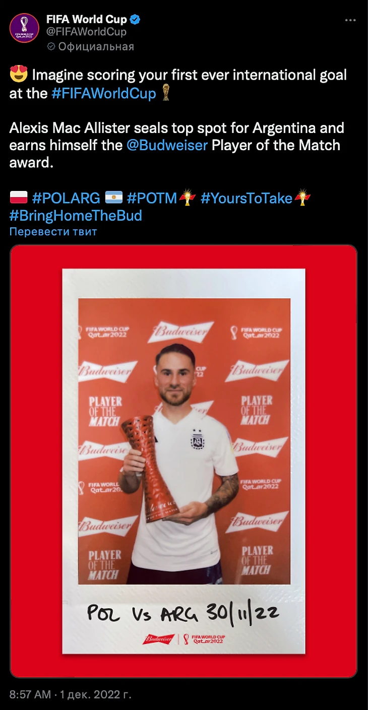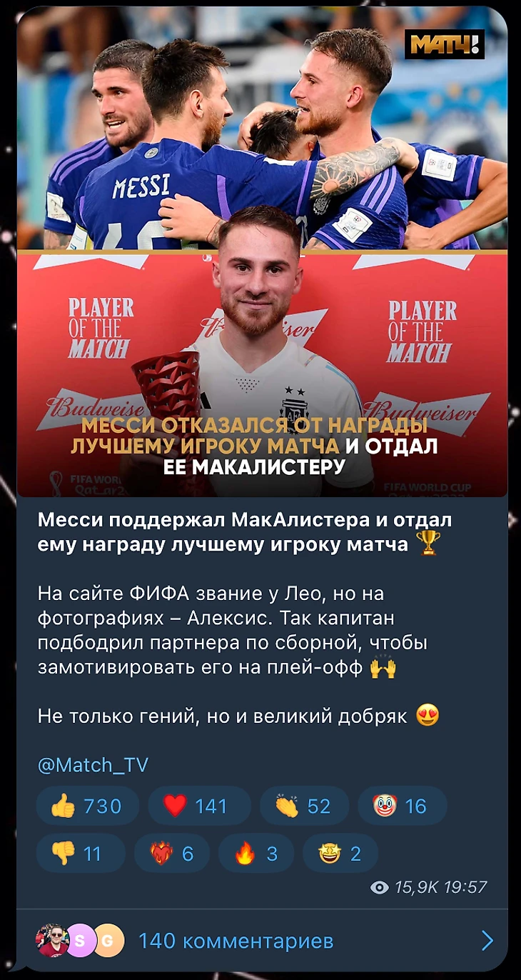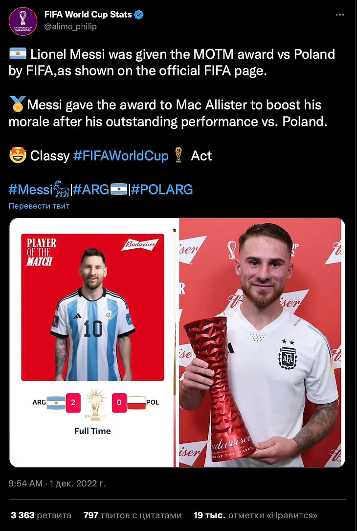 Несмотря на то, что Месси ушел с поля с нулем голов и ассистов, а в первом тайме еще и не забил пенальти, после матча завирусился красивый сюжет о Лео. Якобы он получил приз игроку матча, но благородно пожертвовал его Алексису, забившему гол. Кажется, все и правда так. У твита почти 20 тысяч лайков, тысячи ретвитов, а опубликован он верифицированным аккаунтом с символикой ЧМ. Ну что может быть не так?