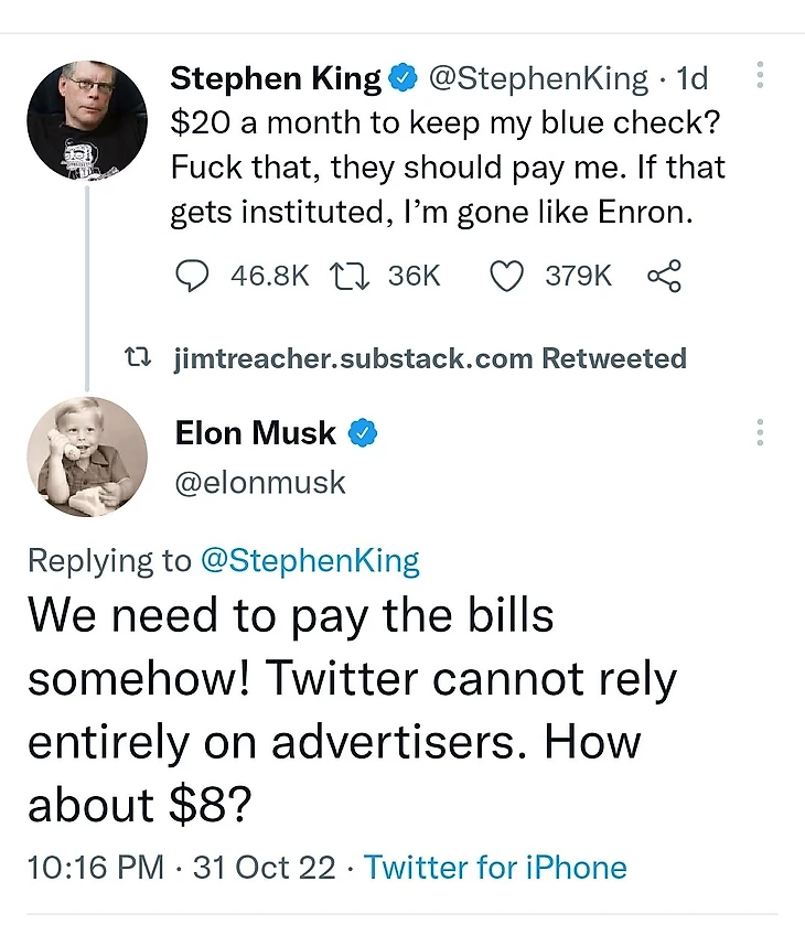 Пользователи не оценили тариф. Так, американский писатель Стивен Кинг написал 31 октября: «20 долларов, чтобы у меня осталась голубая галочка? Да нахрен это нужно, пусть они мне платят». В реплаи пришел Маск: «Нам нужно как-то оплачивать счета. Твиттер не может рассчитывать только на рекламодателей. Как насчет 8 долларов?».