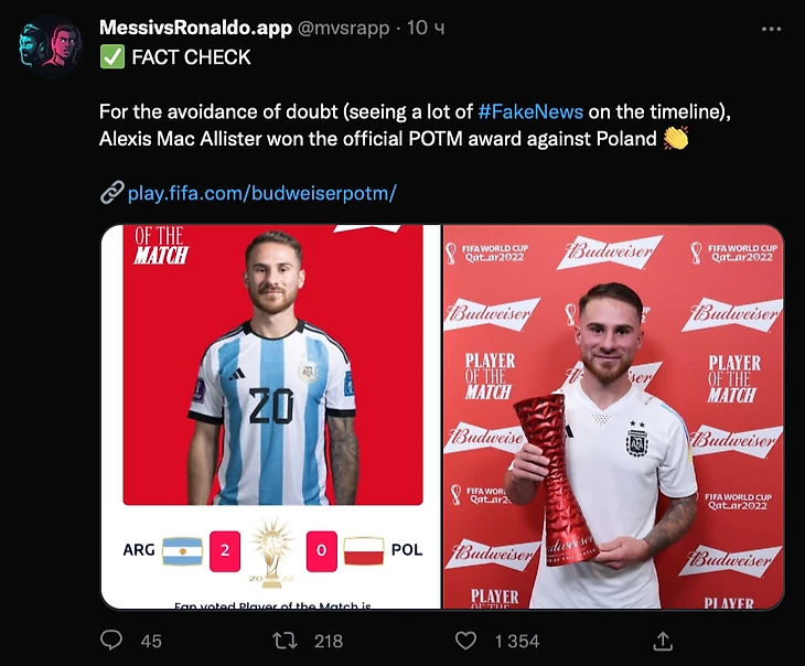 Парень разоблачил обман довольно быстро – проверил результаты голосования за игрока матча на официальном сайте ФИФА. Там приз был отдан Мак Аллистеру – без благородного вмешательства Месси.