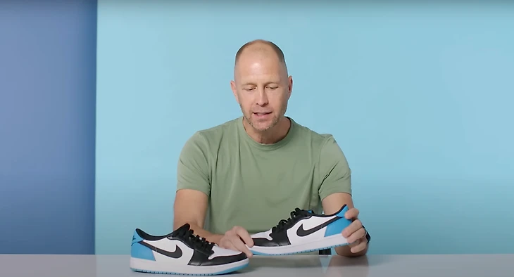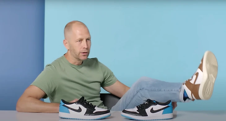 USA Today даже запустил трекер обуви Грегга: что он наденет на этом чемпионате мира. Впечатляющий масштаб.  Доставать редкие пары (например, ту, с которой мы начали этот текст) помогает сам Nike. «Мне повезло быть спортсменом Nike уже больше 25 лет. Поэтому мне удается раздобыть некоторые новинки до официального релиза».  Подробно о любви к кроссовкам Грегг рассказал, когда был в гостях у GQ Sports. В рубрике, где знаменитости говорят о десяти вещах, без которых не могут жить, кроссы тренер сборной США поставил на второе место. Первое – у вермута, с которым он делает любимые коктейли («Манхэттен» и «Негрони»).  Когда Берхалтер рассказывал, на столе красовались Air Jordan 1 Low SE Black Laser Blue за 115 евро.