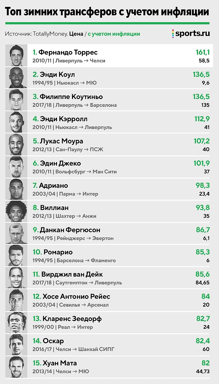 Разобрались с футбольной инфляцией – и теперь пересмотрим топ зимних трансферов с учетом новых знаний. Сначала напомним список без нее.