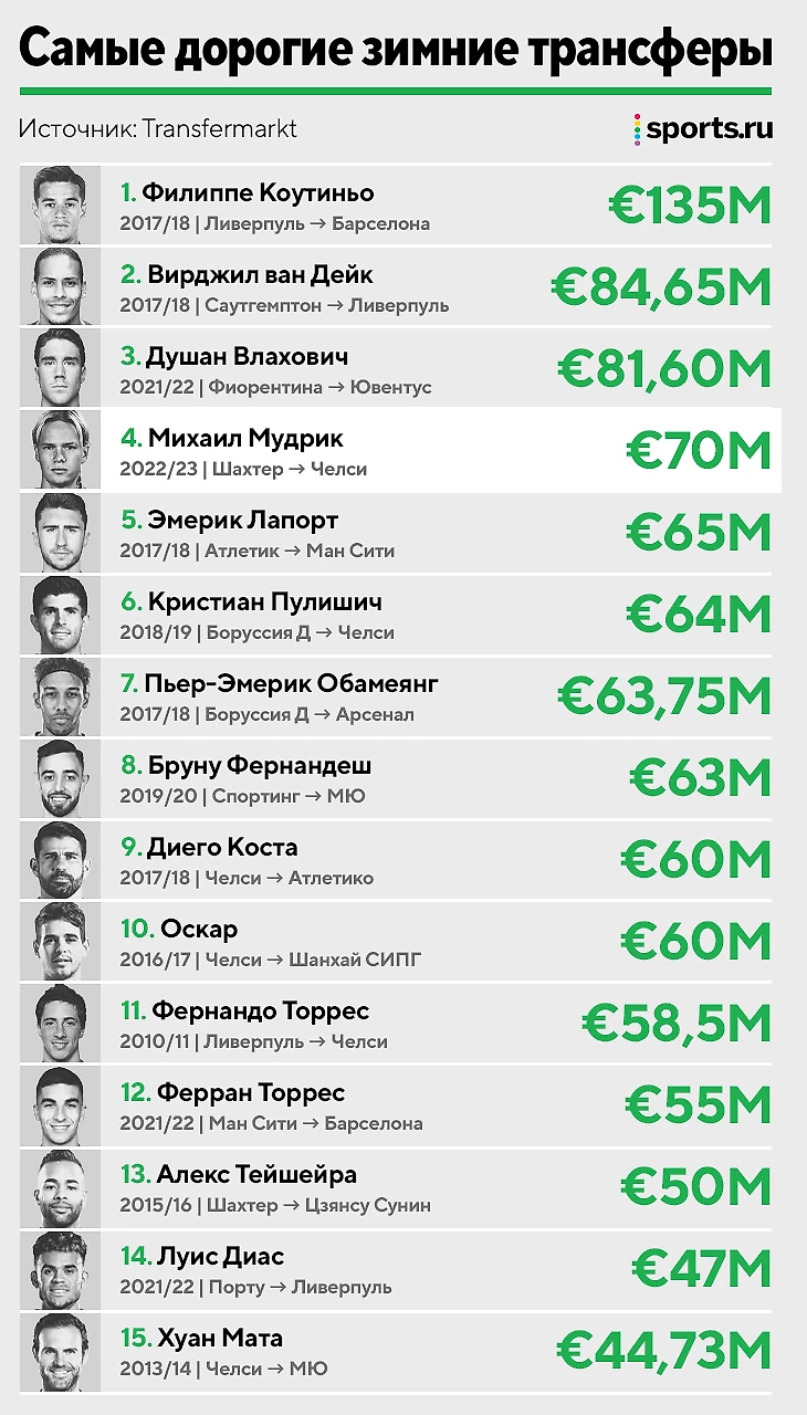 • 70 миллионов за Мудрика с учетом инфляции сползли с 4-го на 25-е место.