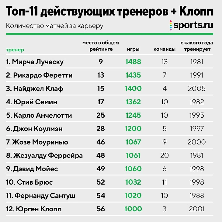Немец стал 56-м тренером в истории, который доходил до тысячи матчей. Такое количество делает сравнение с историческим топом бессмысленным − до него невероятно далеко: чтобы догнать топ-10, Юргену понадобится еще 500 игр.