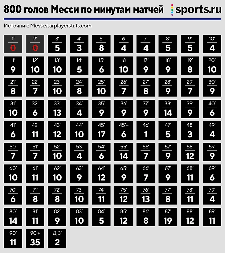800 голов Месси в двух картинках. Показываем мячи по сезонам и минутам