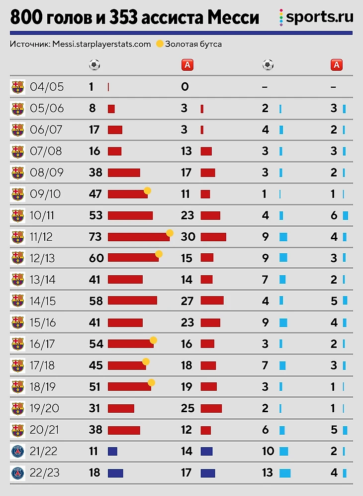 У Лео 701 гол за «Барселону», «ПСЖ» и 99 в сборной. Как и кому забивал Месси, мы подробно подсвечивали вот тут – когда он забил 700 мячей в клубной карьере.