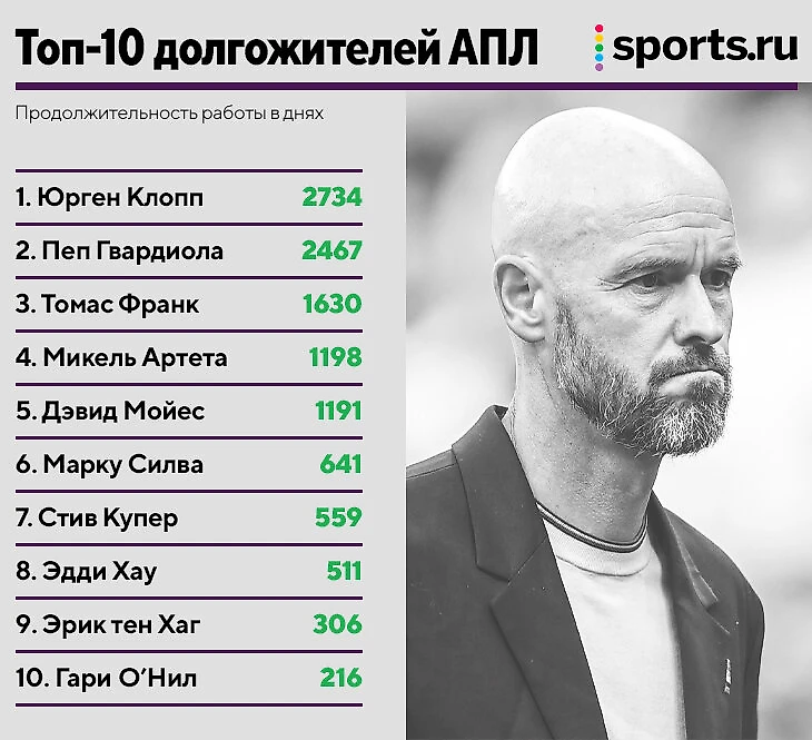 Отставок так много, что Тен Хаг уже 9-й в топе долгожителей.