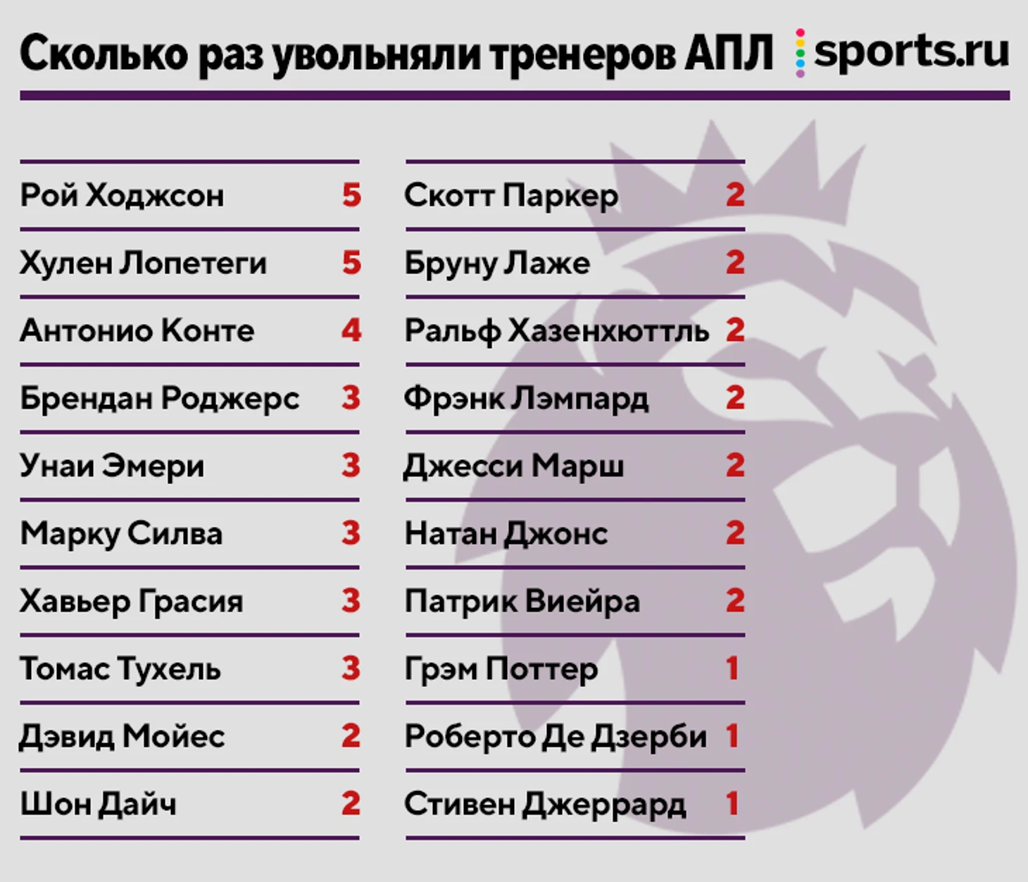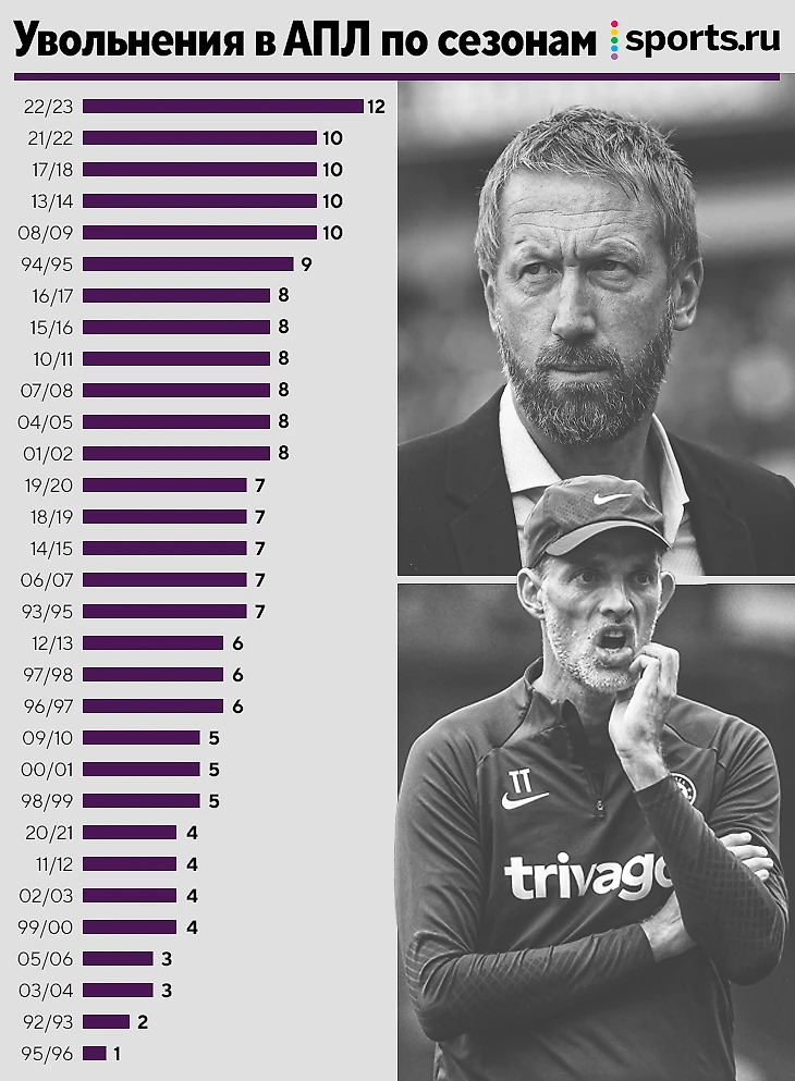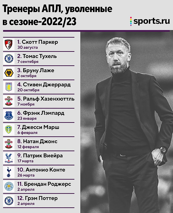 • 12 увольнений за сезон – рекорд. Opta вообще считает 13, правда в формулировке «уход»: для перехода в «Челси» Грэм Поттер ушел из «Брайтона».