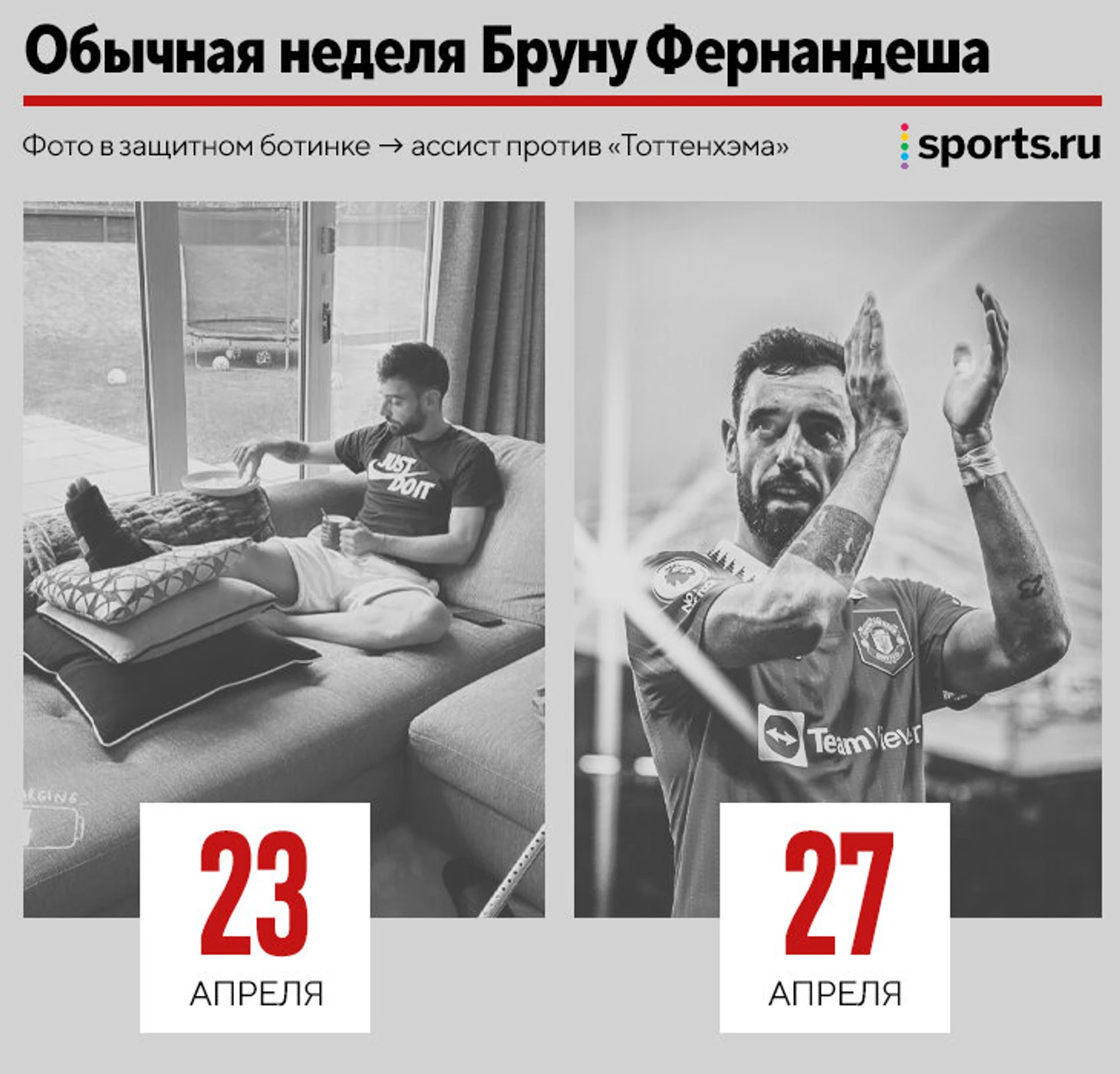 Но Бруну восстановился очень быстро: Эрик тен Хаг объяснил, что защитный ботинок, в котором он был на фото, это мера предосторожности − и травма не помешала португальцу провести с «Тоттенхэмом» полный матч.