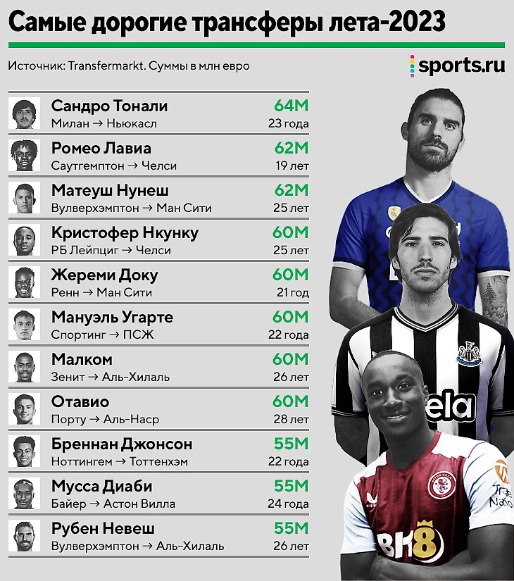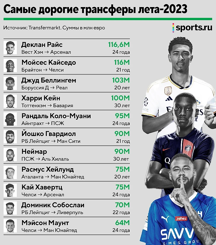 • Летом-2023-го клубы не жалели денег на игроков – 7 трансферов пробили отметку в 90 млн евро, четыре – 100 млн; • Активнее всего тратила АПЛ. В топ-11 самых дорогих покупок сразу 7 провернули клубы из Англии. Два рекордных трансфера окна – тоже из АПЛ; • В топе преобладают молодые игроки. 9 из 11 – моложе 25 лет, из опытных только Кейн и Неймар.
