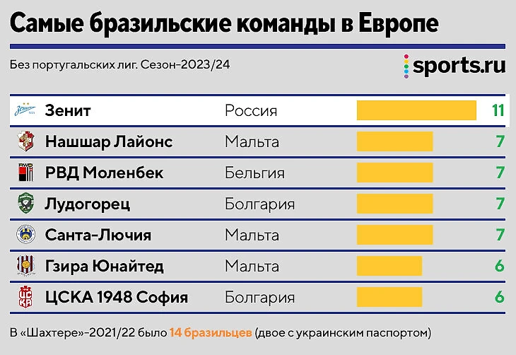 ● Отдельно отметим «Шахтер»-2021/22, который мог бы возглавить этот топ: до зимы команде были 14 бразильцев (Марлос и Жуниор Мораэс имеют и украинское гражданство). Сейчас клуб постепенно возвращает присутствие – этим летом пришли четыре бразильца.