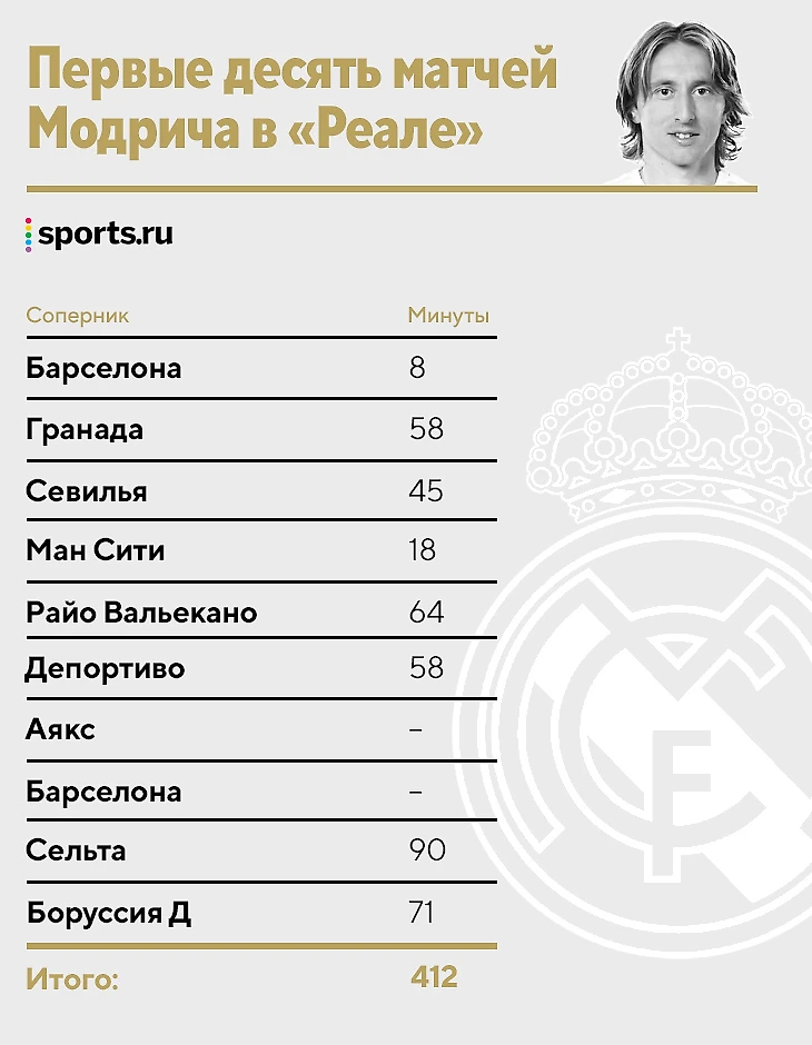 «В аэропорту меня встретили сотрудники «Реала» и репортеры клубного телевидения. Они транслировали каждый момент моего понедельника. У меня было ощущение, будто я самый важный человек в мире», – первый день Луки в Мадриде был пропитан положительными эмоциями. А дальше начались сложности. Игровое время на старте карьеры в «Реале» было крайне дозировано. Из первых десяти матчей он провел полностью только один, а в двух вообще не вышел на поле.