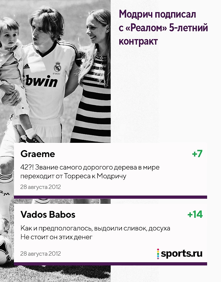 Отматываем ленту Sports.ru до 2012 года и смотрим новость о переходе Модрича в «Реал». Большинство комментаторов явно не в восторге от трансфера. Вот лишь пара ярких примеров.