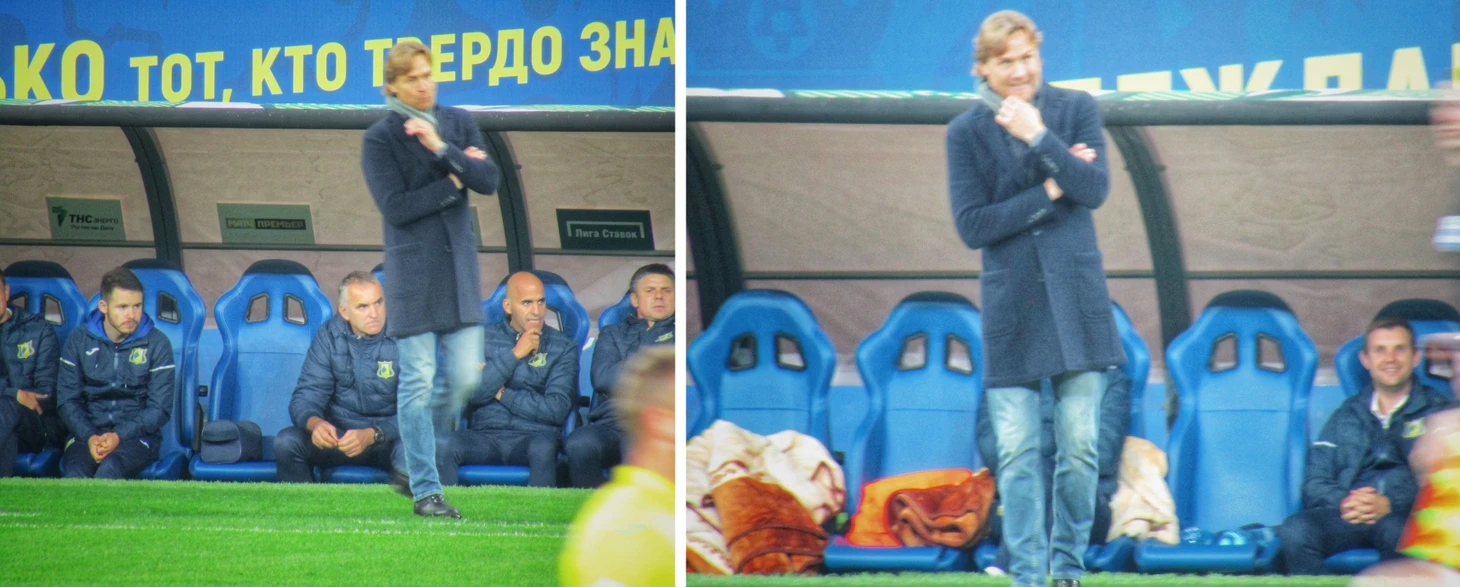 Валерий Георгиевич Карпин. Весь в игре и постоянно нервничает; и есть повод, ведь команда создает большое количество моментов, но реализовать удалось лишь раз.