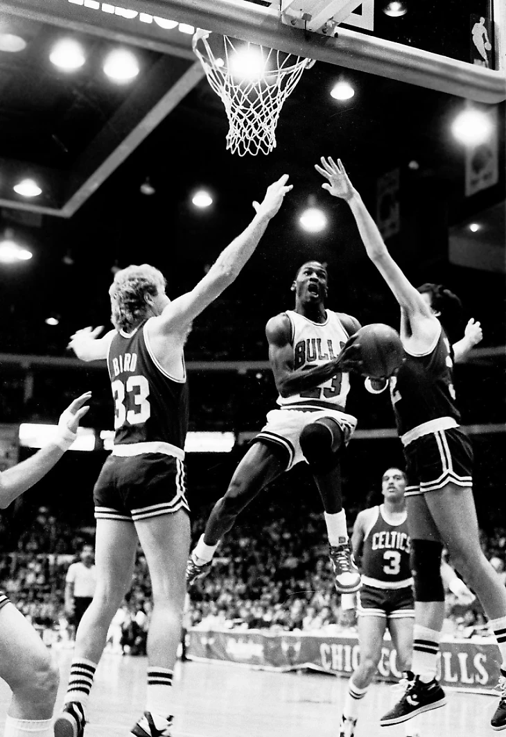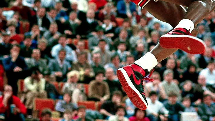 1985 год, слэмданк-контест в Индиане, на Майкле ставшие легендарными кроссовки в расцветке «Bred» (black/red) или же «Banned»