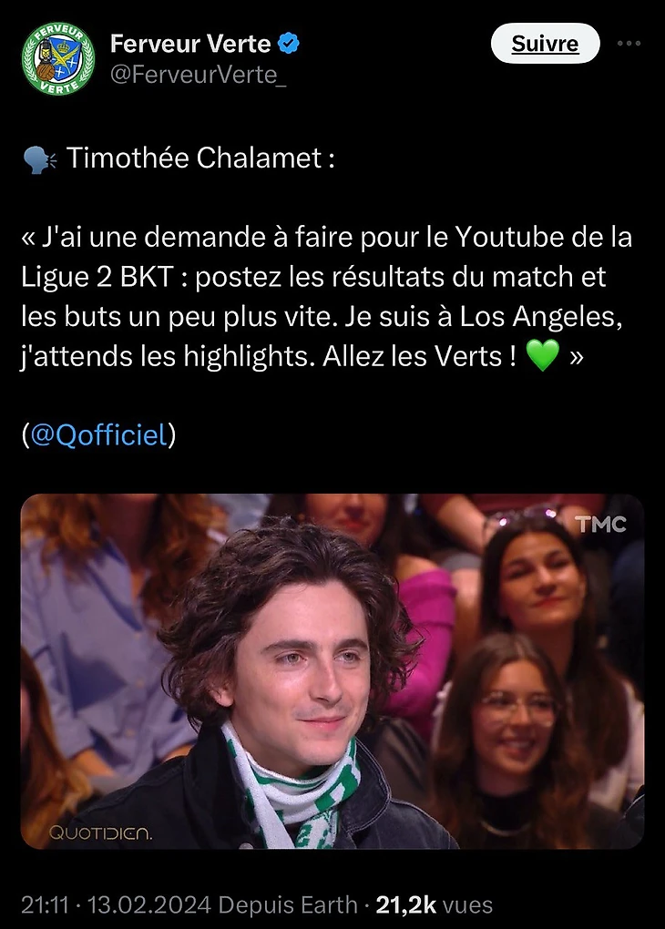 В разгар французского промоушена мегаблокбастера Дени Вильнева «Дюна 2», который выходит в кинотеатрах в конце февраля, очень, очень модный Тимоте Шаламе оказался на съемках Quotidien on TMC в этот вторник. И его, конечно же, спросили о его известной страсти к «Сент-Этьену», ведь в детстве он проводил каникулы в семейном доме в Шамбон-сюр-Линьоне (Верхняя Луара).