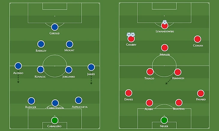 1. “Бавария” имела начальное преимущество в игроках при прессинге соперника - два центральных защитника и два опорных полузащитника против тройки Жиру-Баркли-Маунт. Но благодаря Киммиху делала розыгрыш мяча еще более удобным для себя.