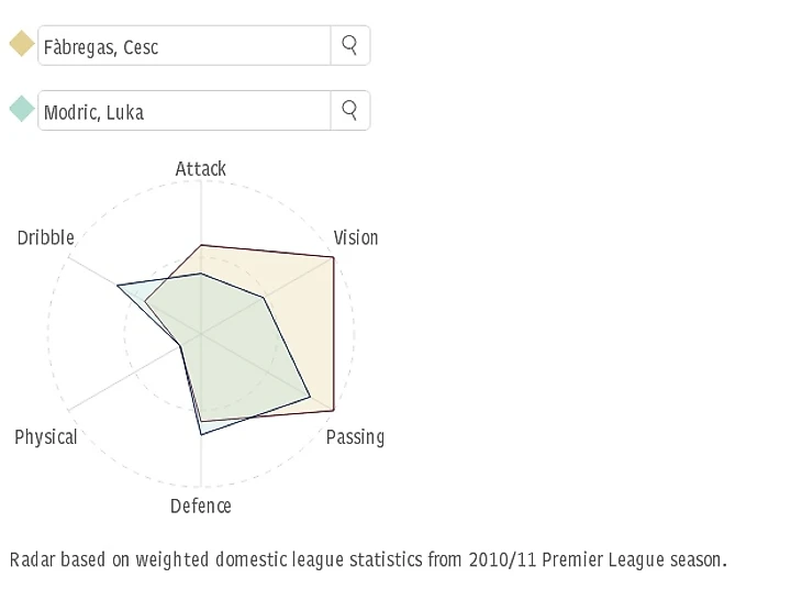 Поэтому картина на радаре выглядит вполне логичным образом. Более низкая позиция на поле в сравнении с Джеррардом не только повлияла на индивидуальные показатели в атаке, но и сделала Сеска более целостным полузащитником, работающим на команду.