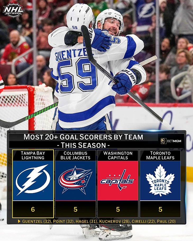 У Тампы 6 игроков, которые забросили 20 и более шайб за сезон. Это самое большое количество хоккеистов, в одной команде с таким показателем в лиге!