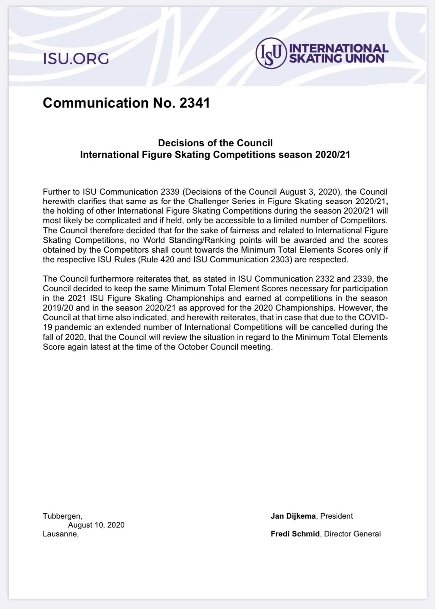 Так же, подтверждая решения принятые в коммюнике N2332 и N2339, принято решение сохранить технический минимум для чемпионатов ISU сезона 19/20 в сезоне 20/21. В связи с тем как развивается ситуация в мире из-за COVID-19 и отмены международных соревнований, ISU рассмотрит ситуацию с техминимумом не позднее чем на совещании в октябре.