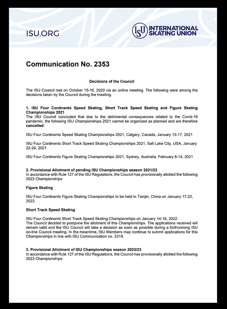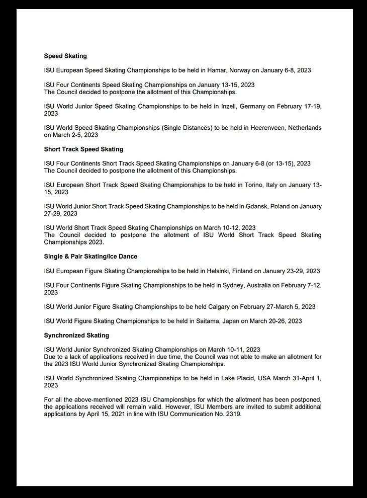 Чемпионат четырех континентов 2023 снова попытаются провести в Сиднее 7-12 февраля 2023.