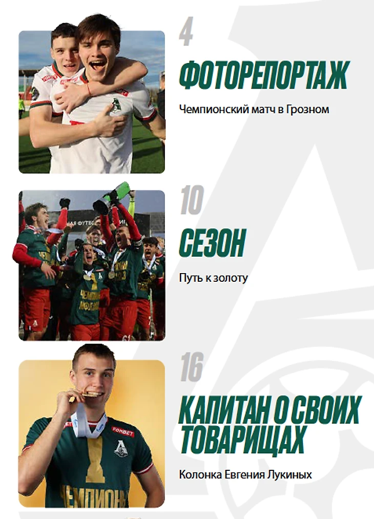 – Молодёжный «Локомотив» завоевал золото МФЛ, и это стало одним из главных событий 2023 года. Основная команда продолжит выступление в чемпионате-2023/24, и концентрироваться на промежуточных итогах вряд ли очень интересно. Напротив, в МФЛ сезон закончился в декабре. И в нём красно-зелёная молодёжка впервые за последние семь лет завоевала чемпионство. Стоящее событие для реализации дебютного проекта! Подтолкнула к этой затее и конкуренция. Перед началом МФЛ-2023 пресс-служба «Спартака» (авторы Олег Кошелев и Игорь Стуров) выпустила 16 страничный буклет о молодёжке красно-белых к началу сезона. Мне такой презентовали как единственное клубное издание в лиге. После таких заявлений не сделать издание в клубе-чемпионе, на мой взгляд, было кощунством 😉
