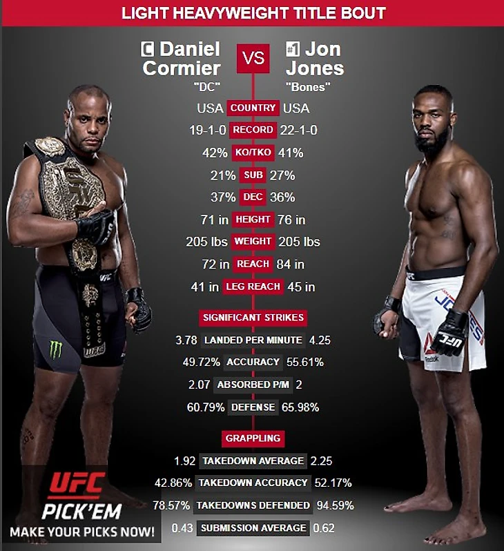 ИТОГ: Будет интересный бой. Оба грозятся финишировать друг друга во 2-3 раундах. Кормье, за время отстранения Джонса, провел 4 успешных защиты, а Джонс был "не приделах", но за это время Джонс стал атлетичнее и физически мощнее. Кормье близится к закату, а Джонс только расцветает. Прошлый бой, Джонс уверенно одолел Кормье, а теперь у него перерыв боях более 2-х лет. По всем показателям - должен победить Джонс, но его единственный бой между отстранений, не вселяет доверия. Возможно перерыв сыграет против и Кормье одержит победу.