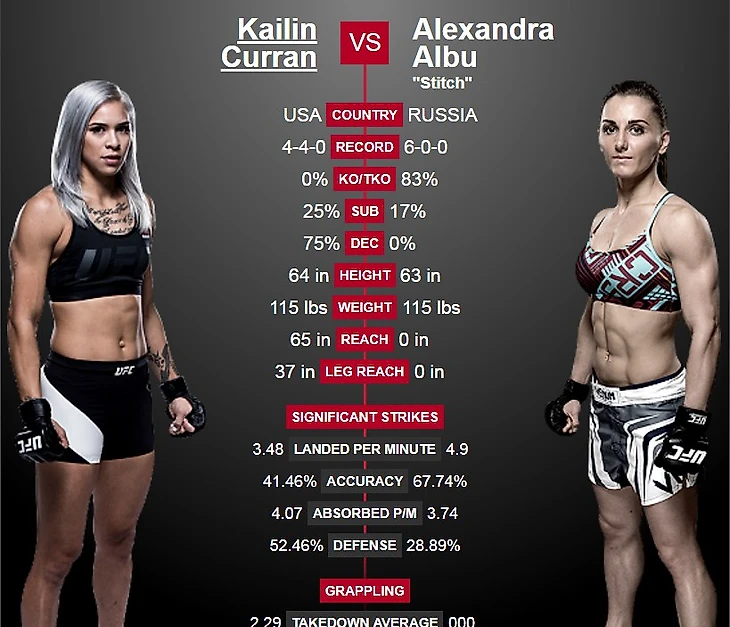 Разогревочный бой великого турнира. "НАША" Александра Албу (так-то молдованка) и Кайлин Кюран. Албу признана одной из красивейших бойцов, а самое главное, ей пророчат великое будущее. Кайлин - вы знаете, кого-то необходимо бить, чтобы набрать статистику.