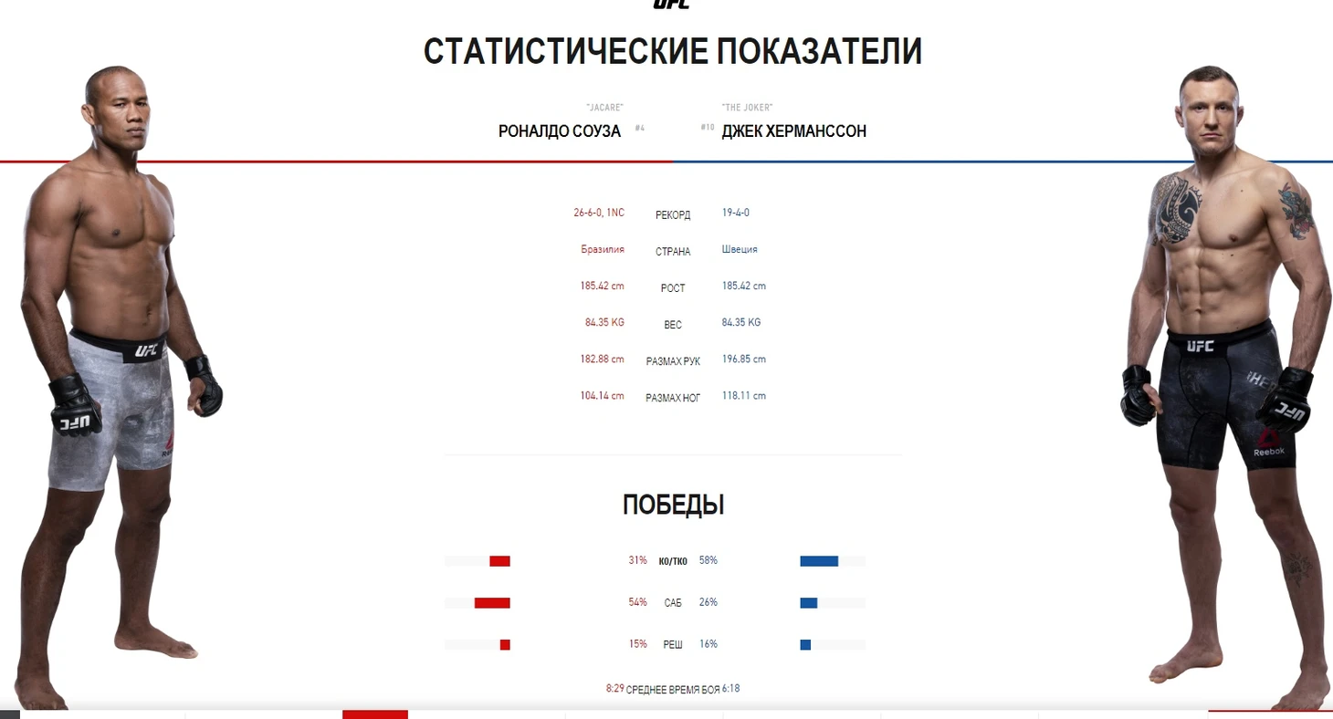 Очевидно, бой будет проходить в стойке. И победит более техничный и выносливый боксёр, коим представляется Жакарэ Соуза, но Херманссон может вязать и растягивать раунды. А время здесь играет только на руку Джокеру. Всё же колоссальный опыт, тяжелейшие удары Роналдо будут преимуществом в бою.