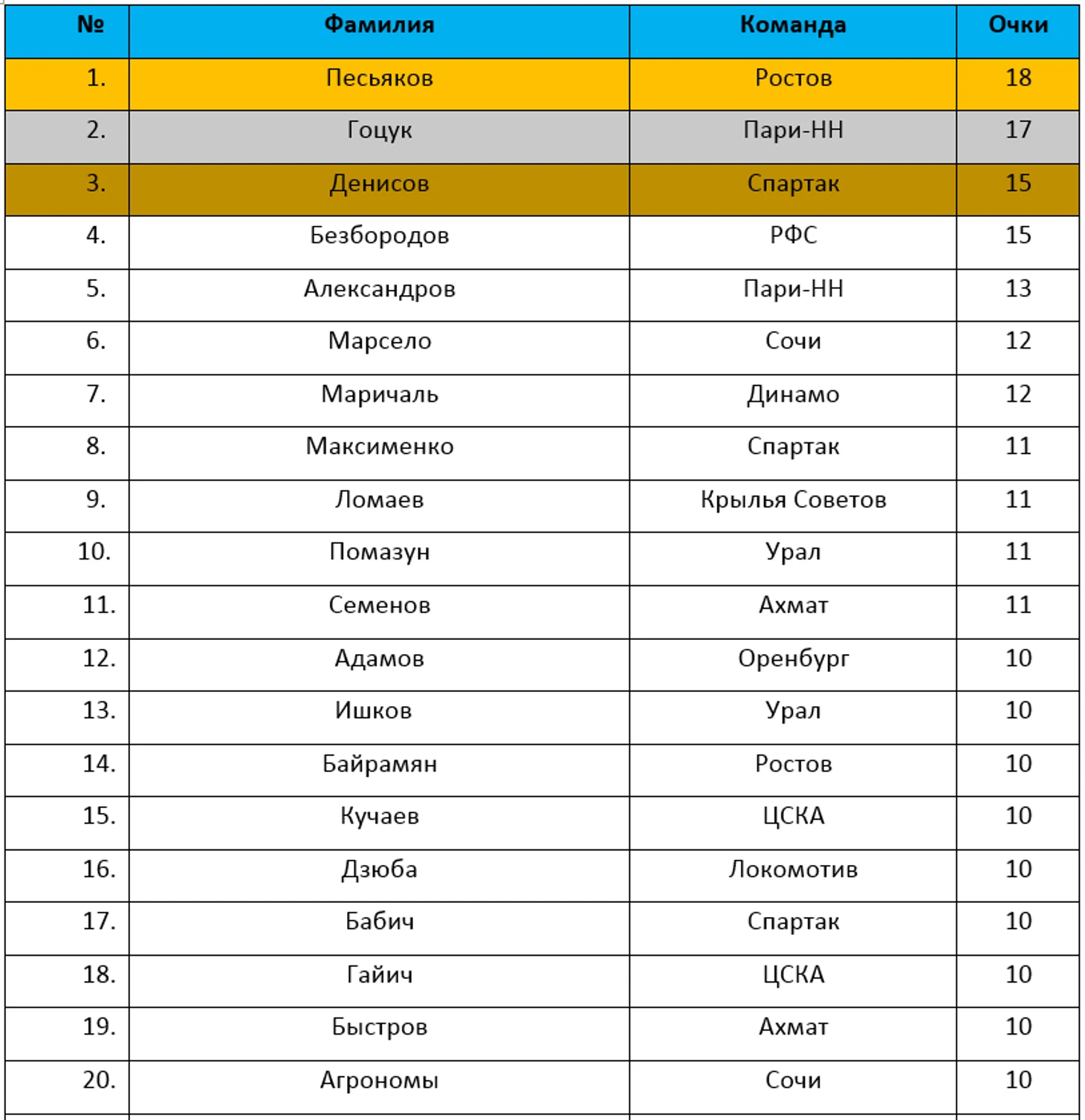Хедлайнерами, надеемся только в этом туре, нашего рейтинга становятся футболисты Сочи. Все началось с гениального выноса от голкипера Никиты Гойло, который еле-еле запустил кожаный снаряд на 20 метров точно в ногу сопернику. Затем горе пенальтисты Дркушич и Нобоа сделали Артура Нигматуллина героем тура в fantasy, все игроки получают по 5 баллов трупДжи.