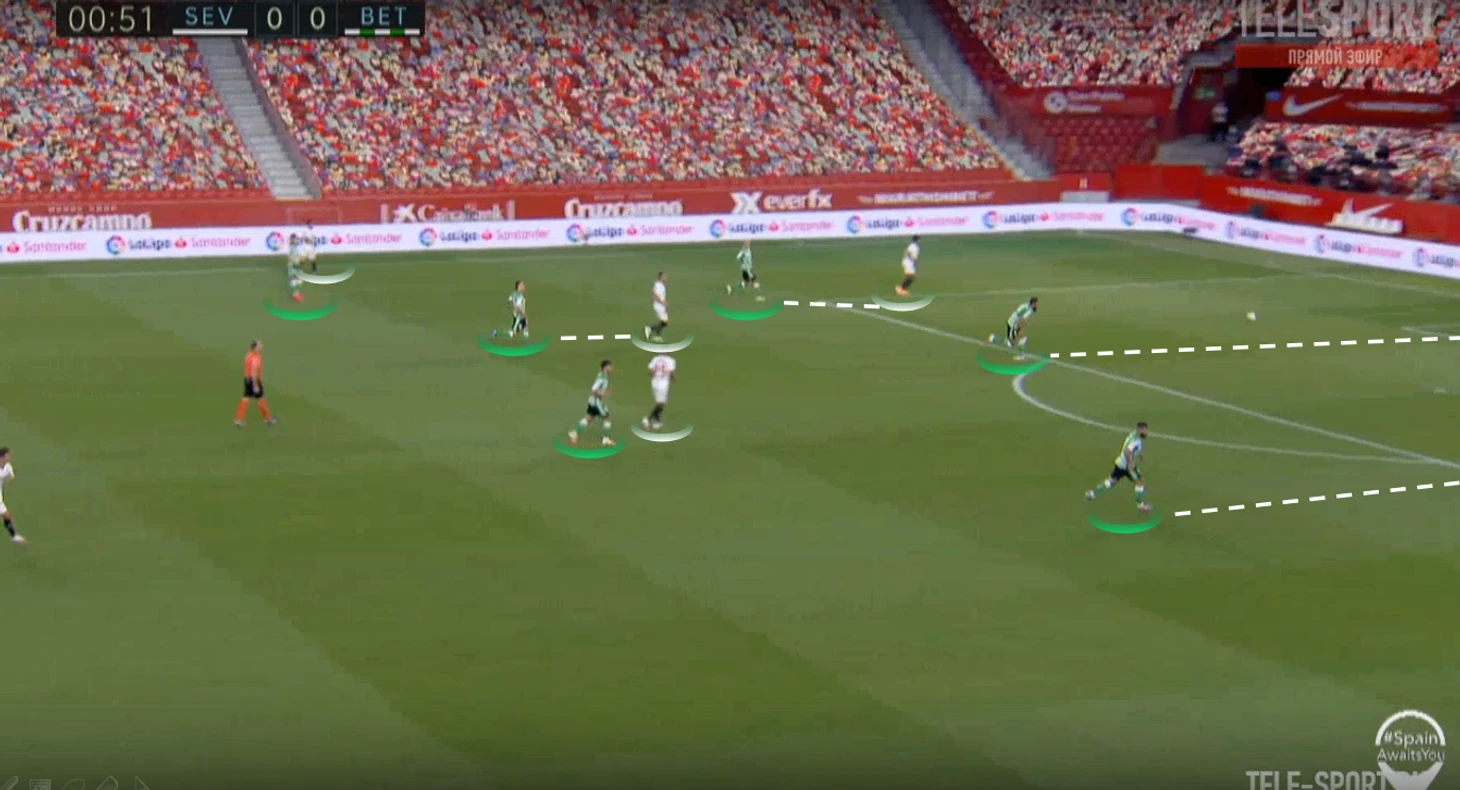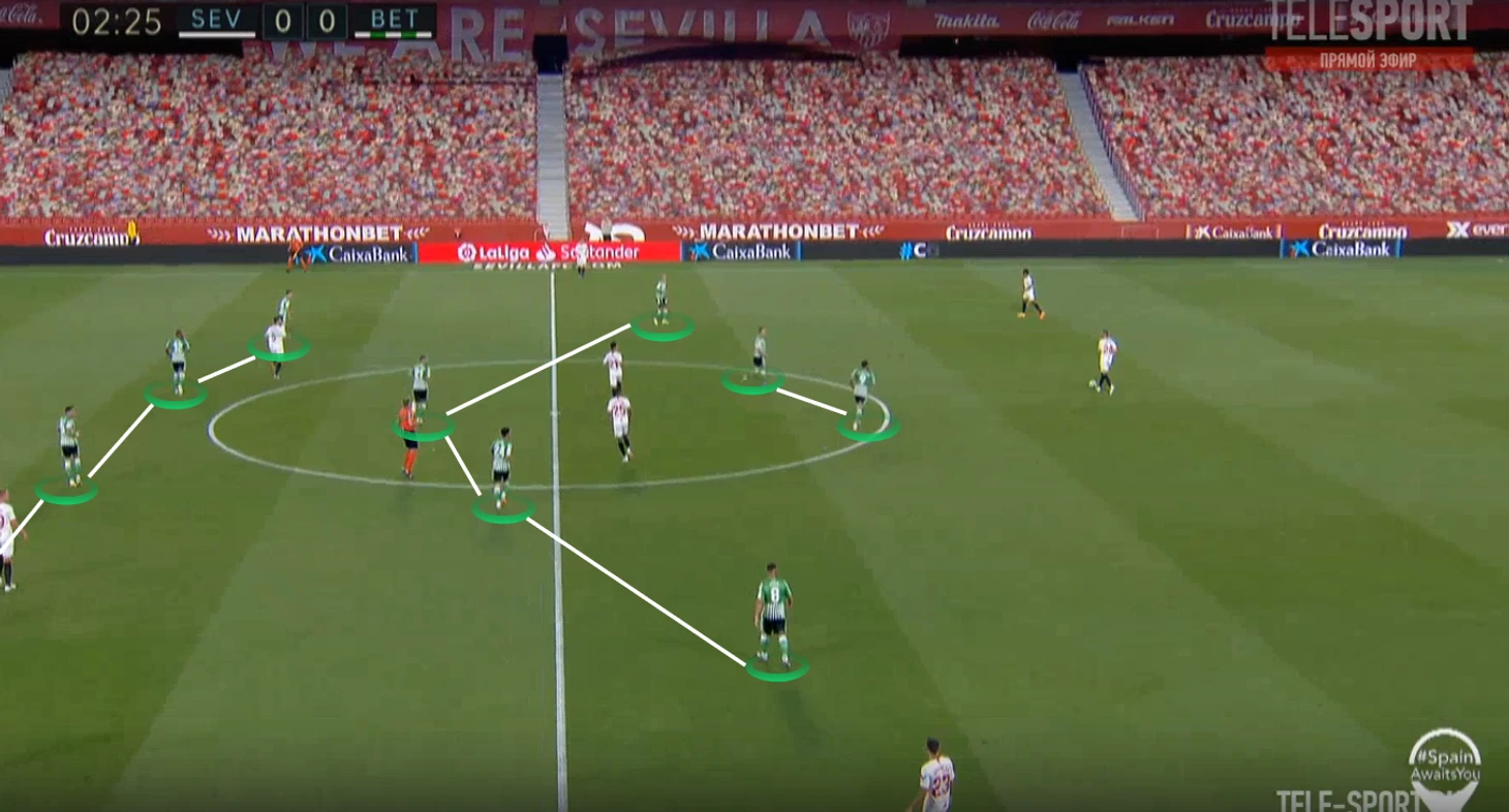 «Бетис» чем-то напоминал «Наполи» в матче с «Барселоной»: изначально команда выстраивалась по схеме 4-5-1, а потом, в зависимости от направления атаки «Севильи», на один уровень с Иглесиасом выдвигался либо Каналес, либо Аленья. От «Наполи» команду Руби отличает разве что более смелое расположение вингеров